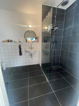 Grote badkamer met douche, wastafel en toilet. Er is een gezamenlijke wasmachine.