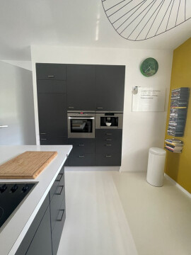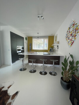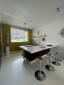 Een heerlijk lichte leefruimte, dankzij de grote raampartijen en de gunstige zon ligging. De open keuken beschikt over een modern keukenmeubel in hoek opstelling en is uitgerust met diverse inbouwapparatuur: koel/vries-combinatie, combi-oven/magnetron, vaatwasser, 4-pits kookplaat en een afzuigkap.
