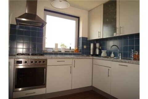Via een deur is het zonnige balkon bereikbaar, hier kunt u heerlijk genieten van de zon en het mooie uitzicht over de groene omgeving. De keuken in een L-opstelling geplaatst en voorzien van een kunststof blad, kookplaat en een afzuigkap Het raam biedt tevens een fraai uitzicht. Naast de keuken bevindt zich een praktische voorraadkast met aansluitingen voor de wasapparatuur.