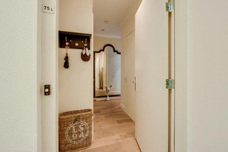 Hal/entree met toegang tot meterkast, badkamer, toilet en woonkamer met open keuken. Het appartement is geheel doorgelegd met een eikenhouten parketvloer.