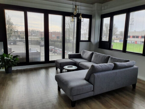 De woonkamer is zeer licht, via schuifdeuren naar het royale balkon.