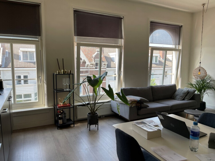 Aan de voorzijde is de woonkamer met keuken gelegen. Overal ligt een mooie laminaatvloer en het pand heeft hoge plafonds.